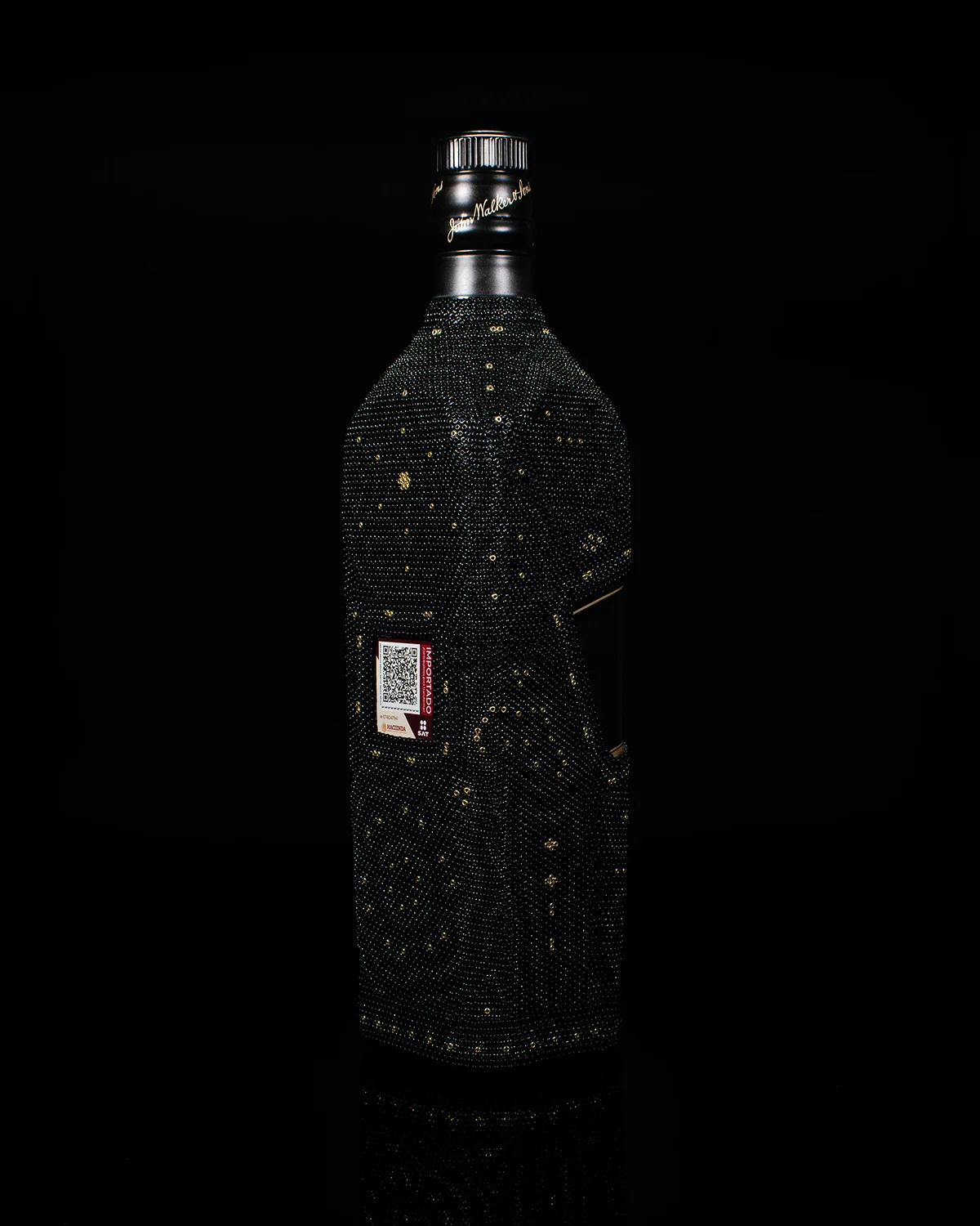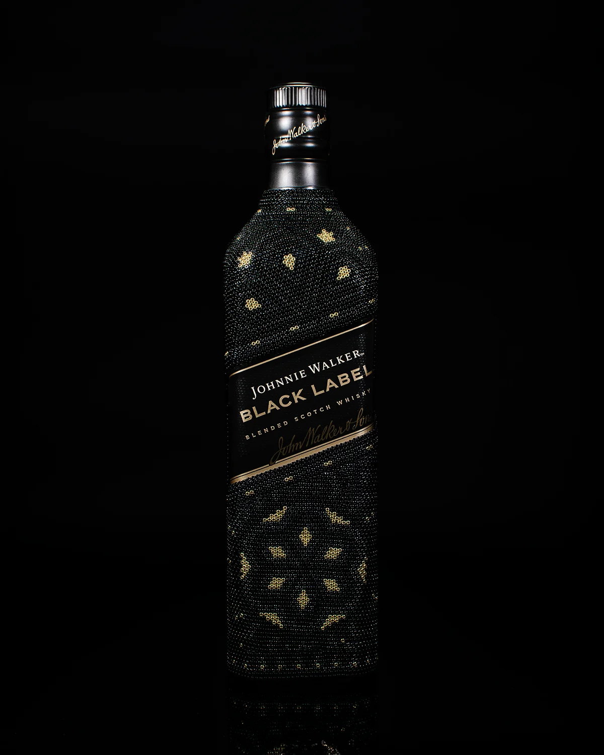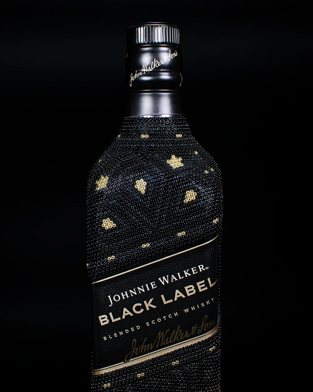 El famoso Etiqueta Negra de Johhnie Walker intervenido por más de 8 horas con más de 8,000 cuentas de vidrio puestas una a una con aguja. Una pieza excepcional.