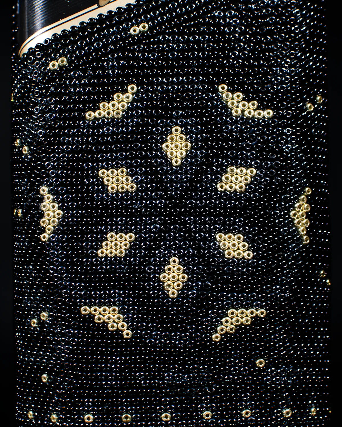 Aplicaciones de cuentas de vidrio colocadas cuidadosamente a mano, creando textura, color y un acabado minucioso.
