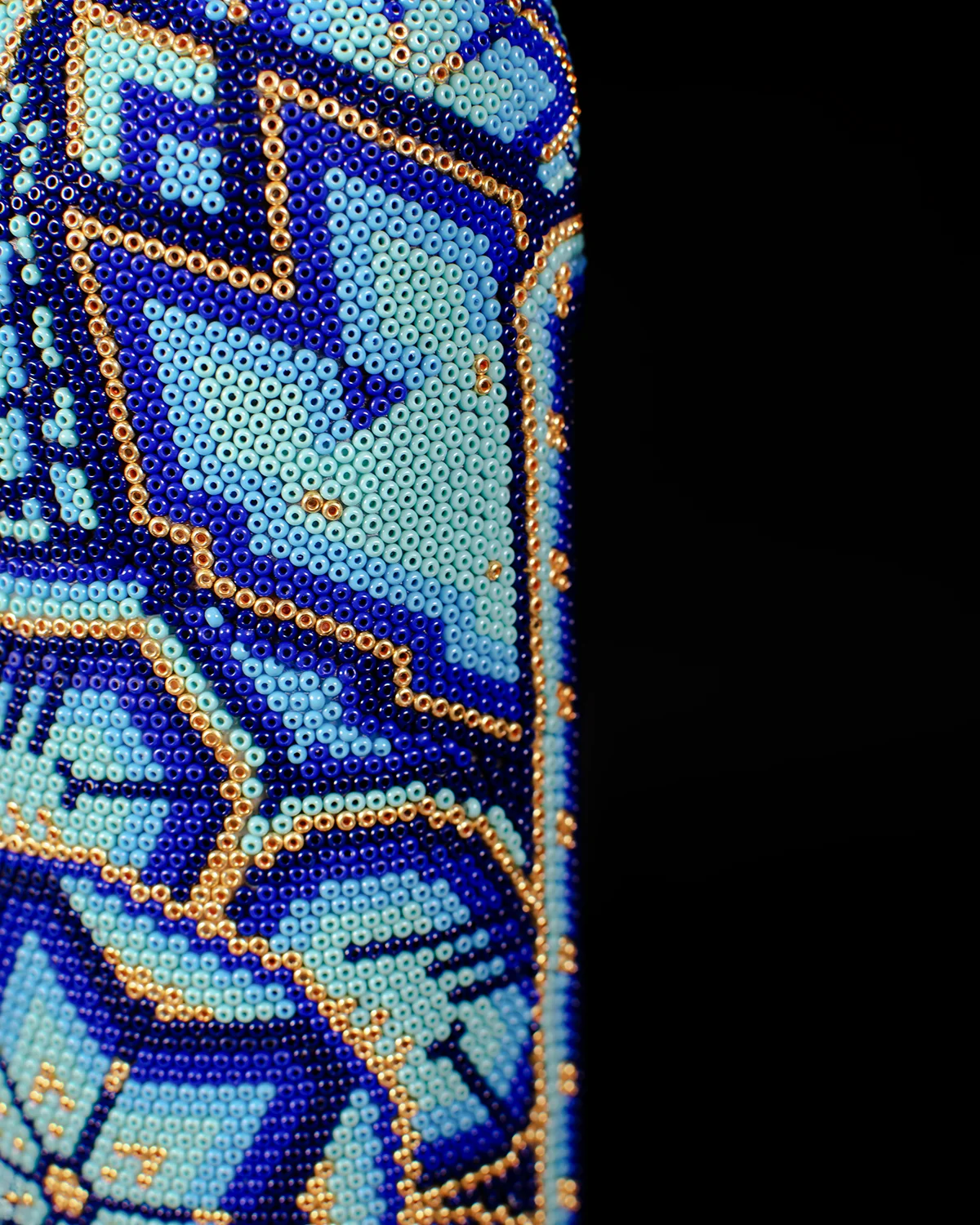Aplicaciones de cuentas de vidrio colocadas cuidadosamente a mano, creando textura, color y un acabado minucioso.