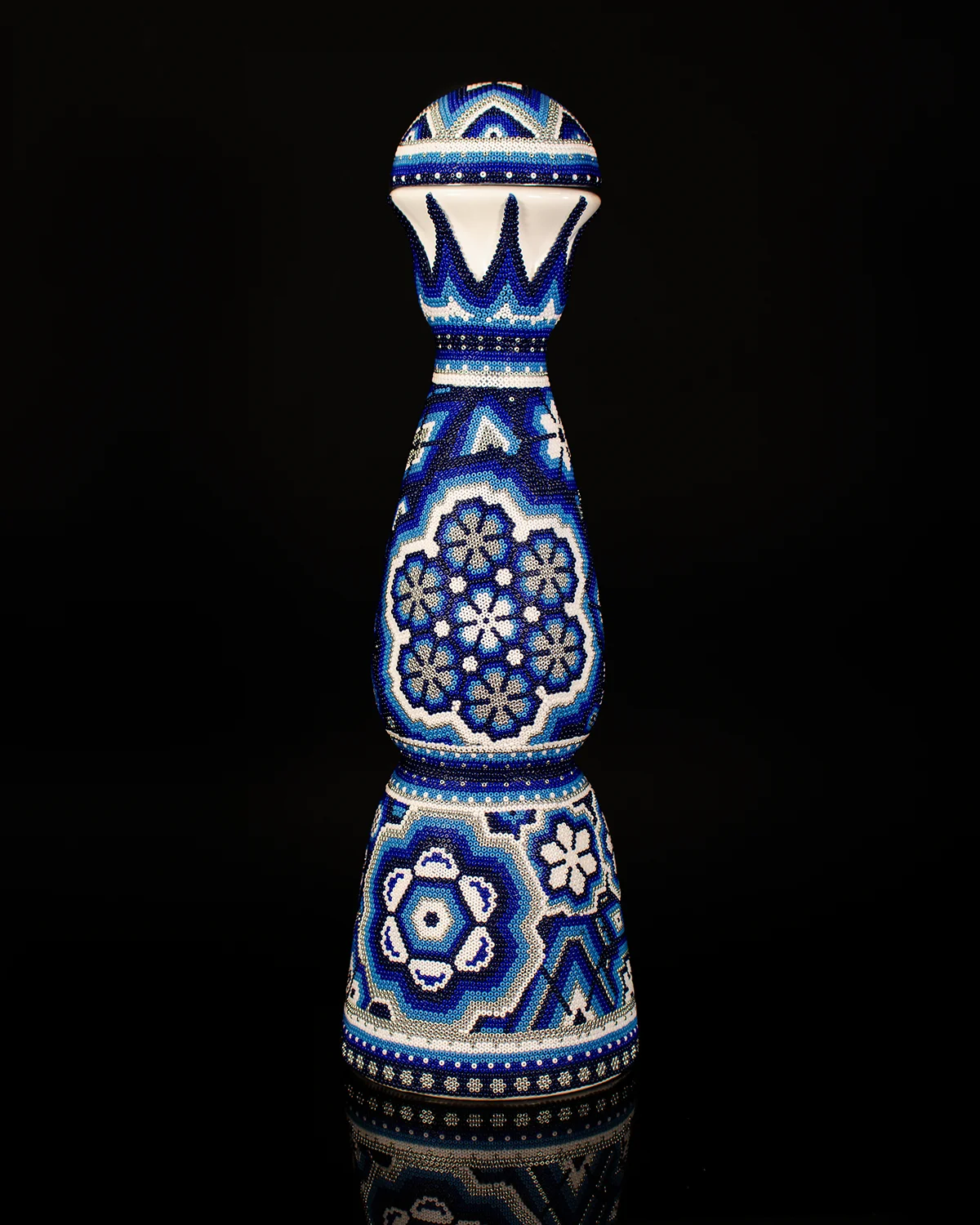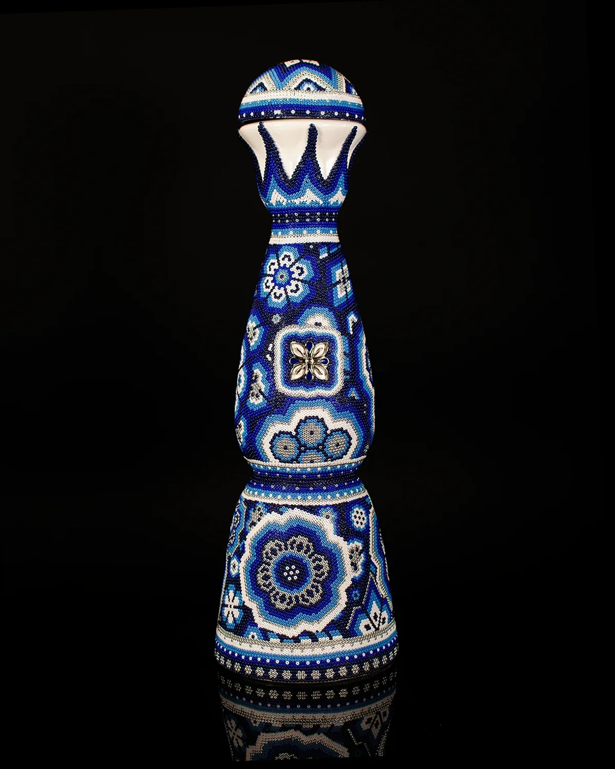 Una de las botellas más espectaculares del mundo intervenida durante horas de trabajo manual intenso con más de 10,000 cuentas de vidrio puestas una a una con aguja.