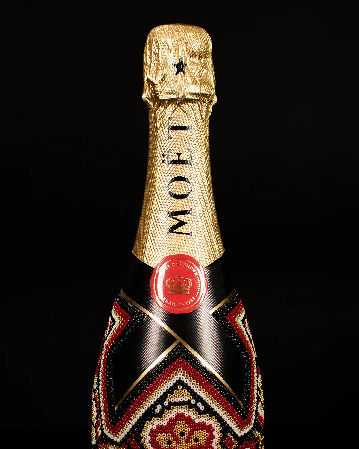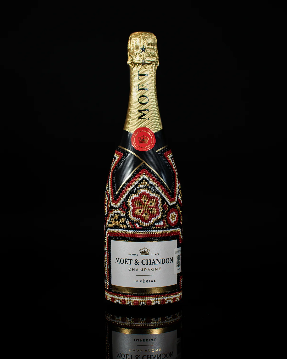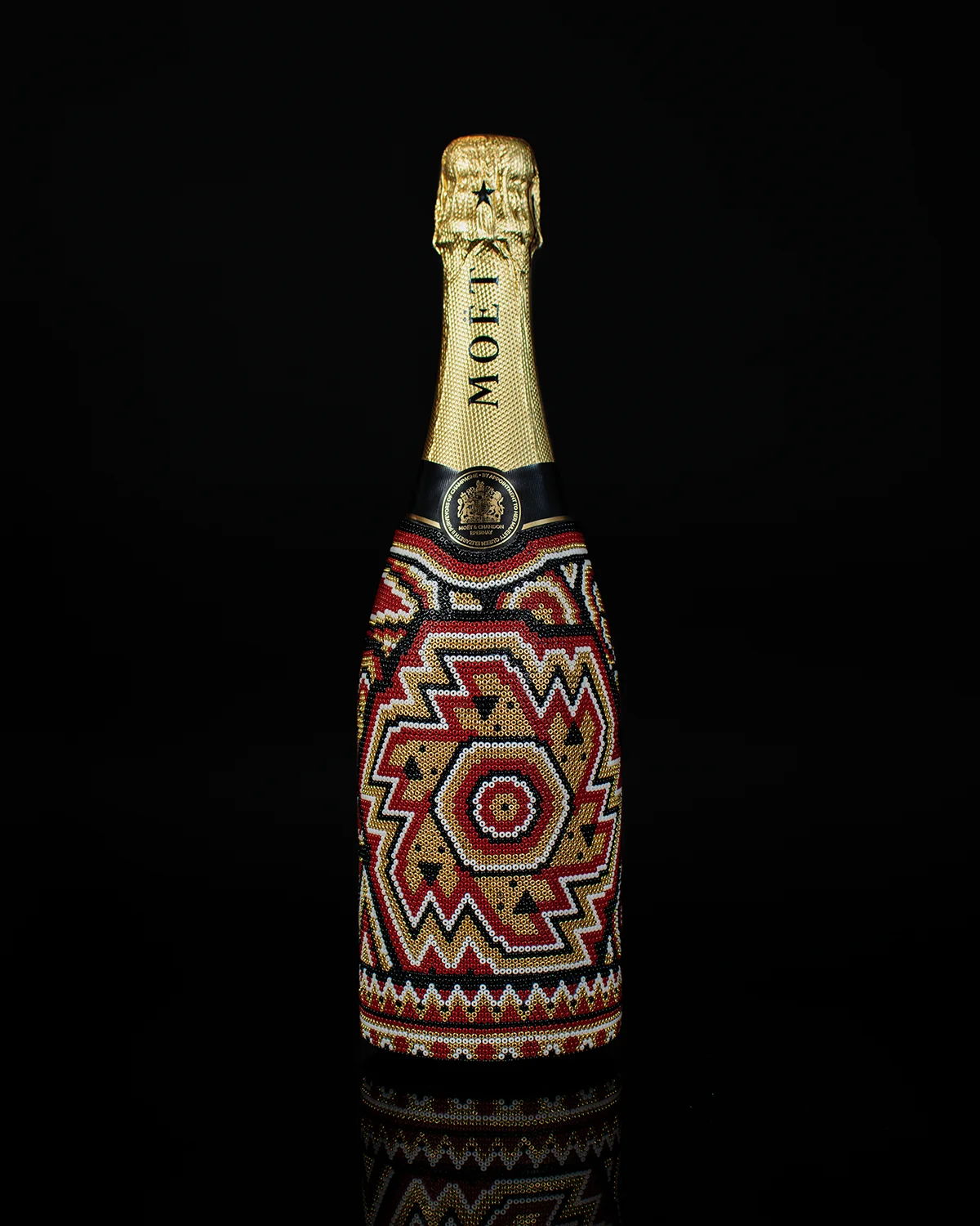 El bestseller mundial: Moët § Chandon, intervenido durante más de 8 horas de trabajo manual usando cerca de 8,000 cuentas de vidrio puestas una a una con aguja, para lograr una obra de arte inolvidable.