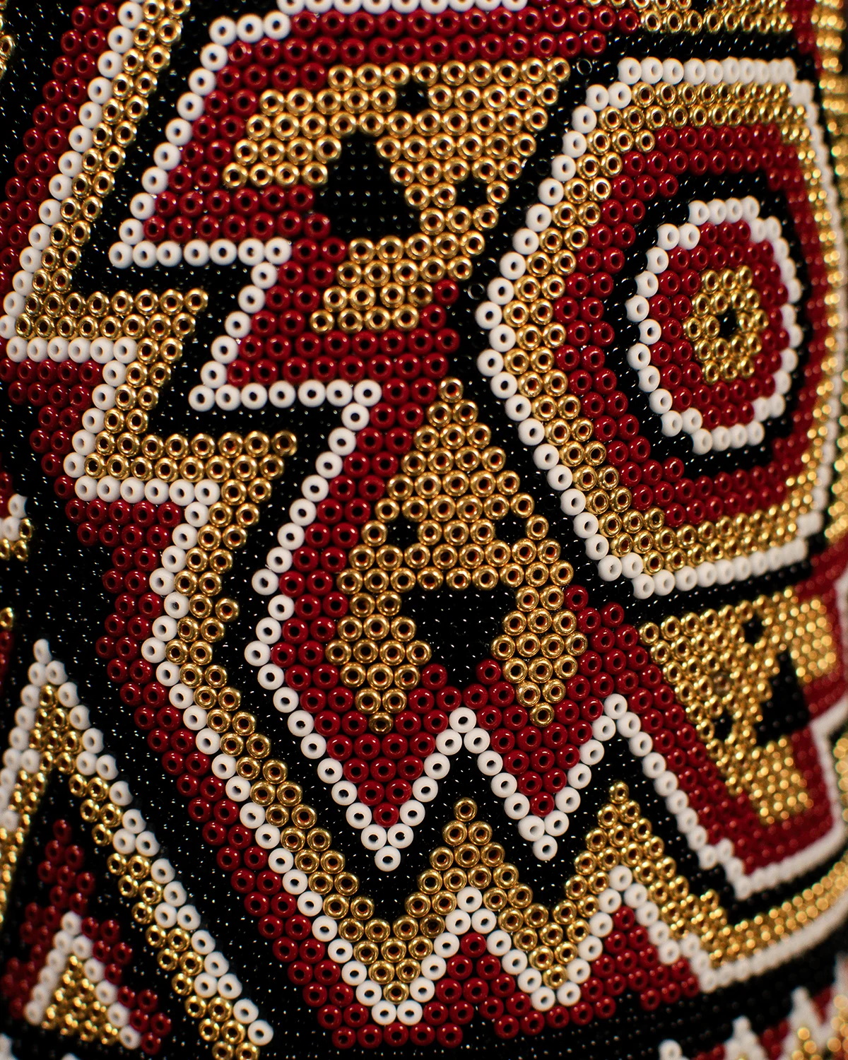 Aplicaciones de cuentas de vidrio colocadas cuidadosamente a mano, creando textura, color y un acabado minucioso.