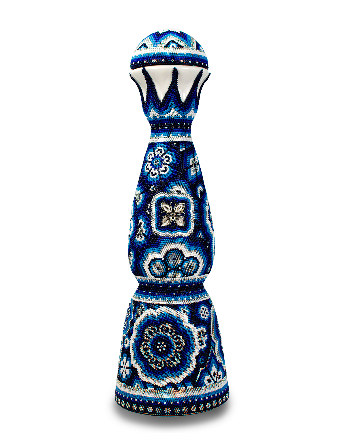 La intervención artística wixárika se realiza mediante la incrustación manual de cuentas de vidrio, una técnica tradicional que requiere precisión, paciencia y profundo conocimiento simbólico. Cada cuenta es colocada individualmente para formar patrones que representan elementos de la naturaleza, la espiritualidad y la cosmovisión wixárika. Este proceso artesanal da como resultado piezas únicas, donde el color, la textura y el detalle convierten cada objeto en una obra irrepetible. Las ligeras variaciones en el diseño son parte de su autenticidad y reflejan el valor del trabajo hecho a mano.
