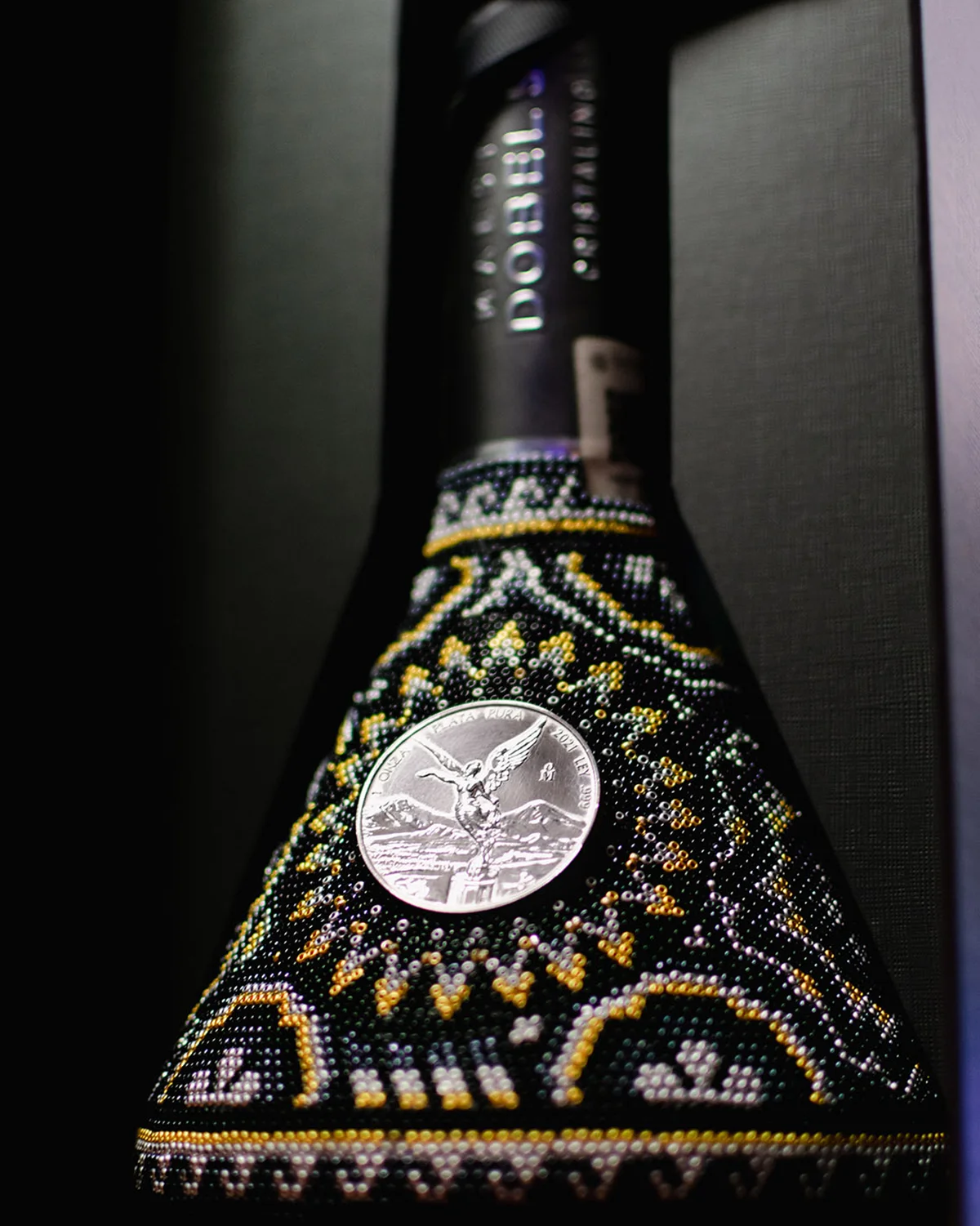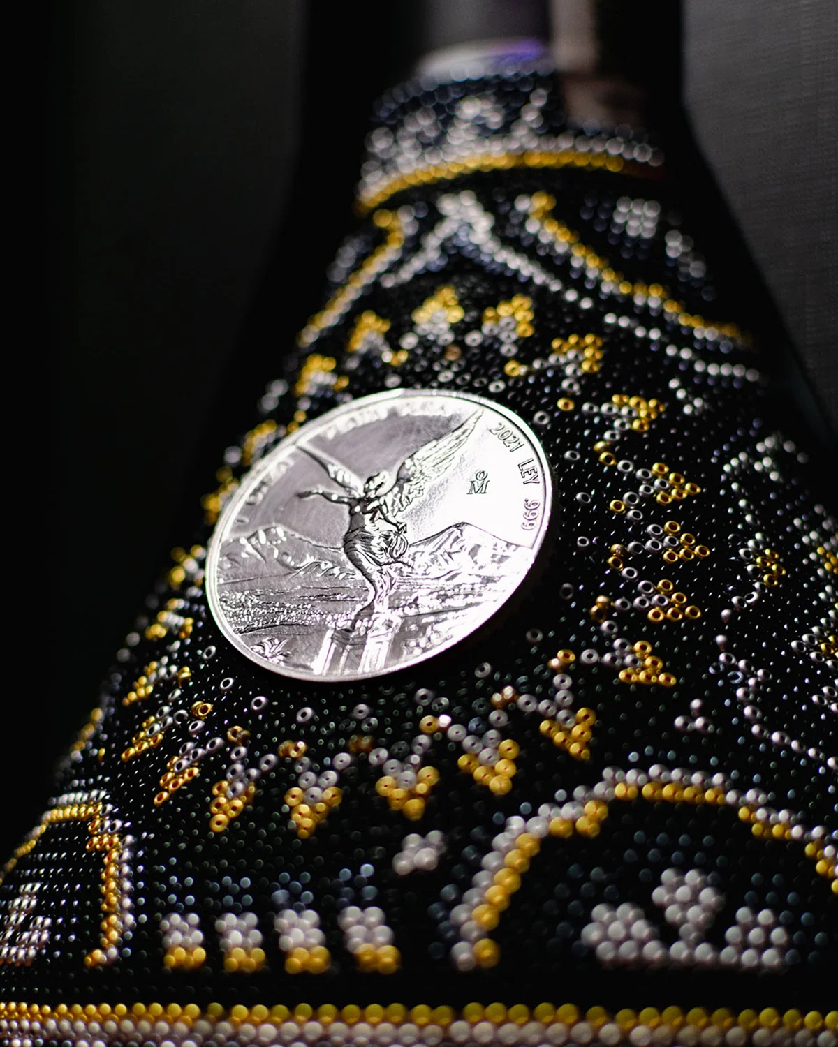 La pieza insignia de Maestro Dobel en su version más espectacular: engalanado con Arte Wixárika original y una Onza Plata Libertad de plata pura (ley .999)