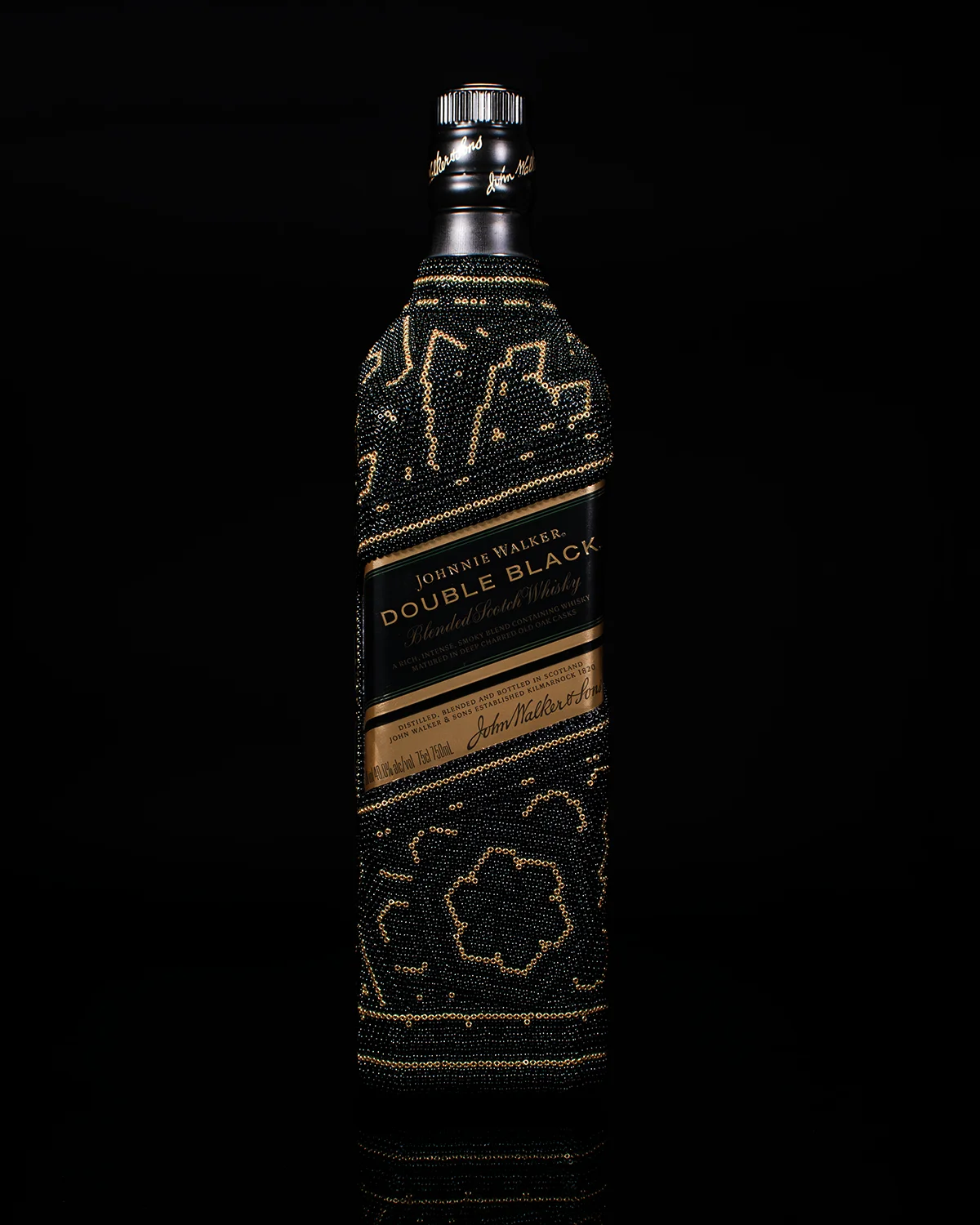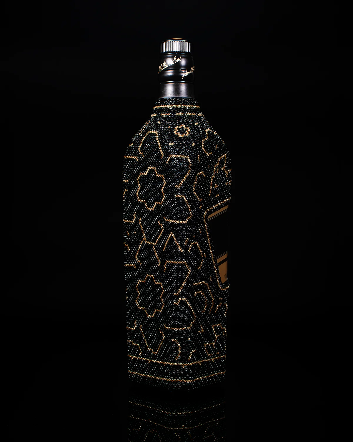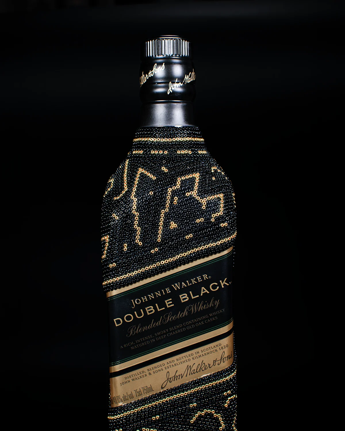 Una etiqueta de culto en Johnnie Walker, elevada a un nuevo nivel artístico. Usando más de 8,000 cuentas de vidrio puestas una a una con aguja durante más de 8 horas de trabajo manual intenso.