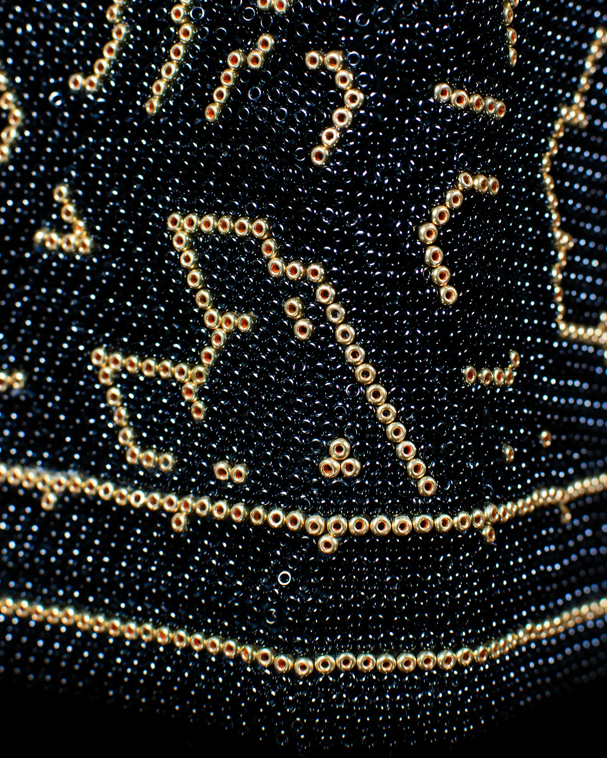 Aplicaciones de cuentas de vidrio colocadas cuidadosamente a mano, creando textura, color y un acabado minucioso.